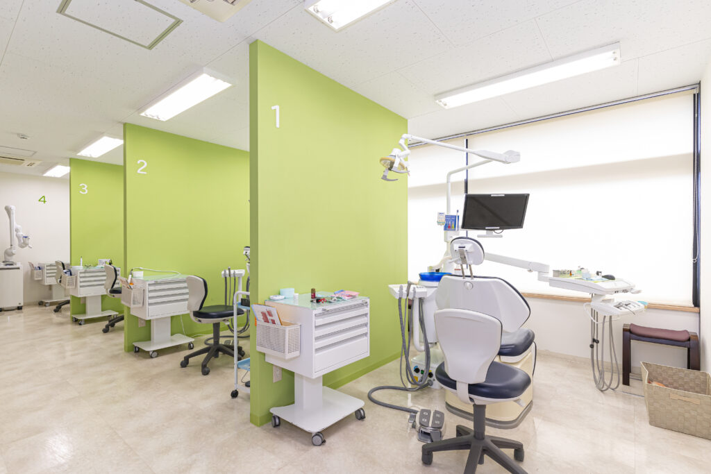 各ユニットは黄緑色の仕切りで区切られ、医院名に使用している「シトラス」の言葉どおり爽やかで清潔感があふれている