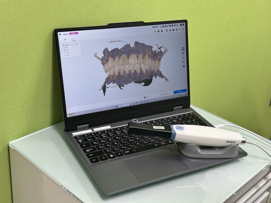 2026年に導入した口腔内スキャナー。歯や歯茎の形状を3D映像として瞬時に映し出せます。ご希望の方には携帯等にデータの送信も行えます